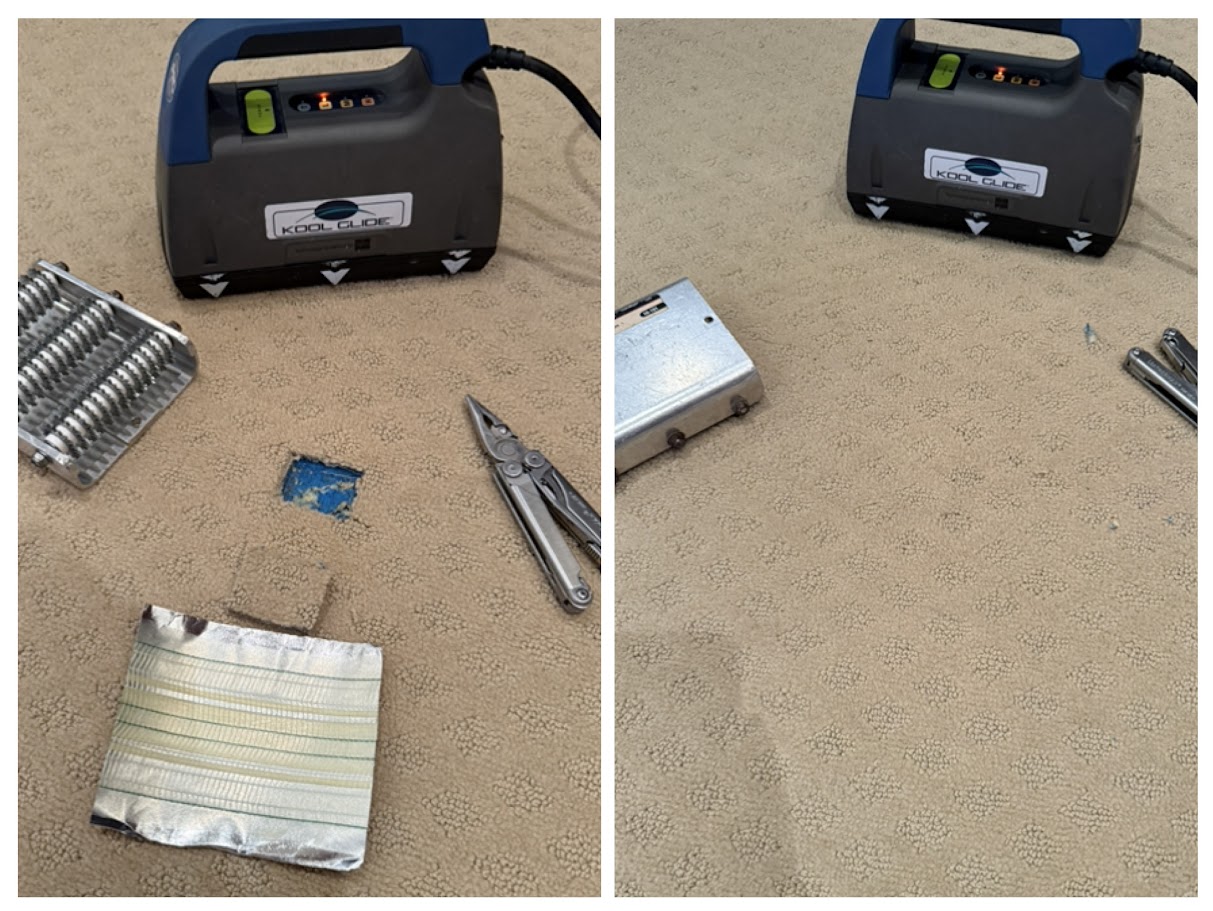At Hughes Dry, we stand behind every repair. Our team follows a meticulous process: cutting the carpet correctly, closing seams, re-tacking it securely, and power stretching it back into place for a smooth, long-lasting finish. We guarantee our work for the life of the carpet because we take the time to do it right.